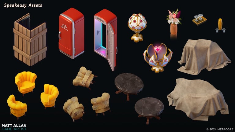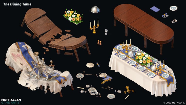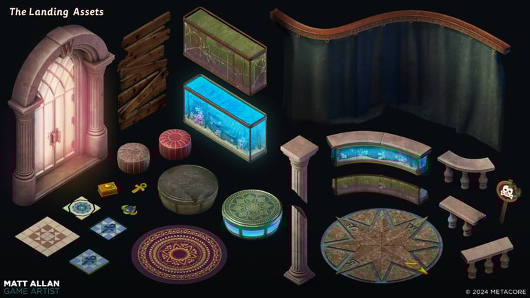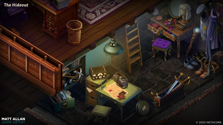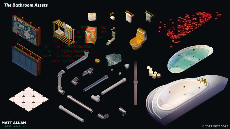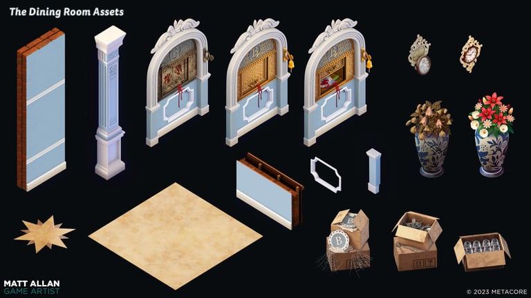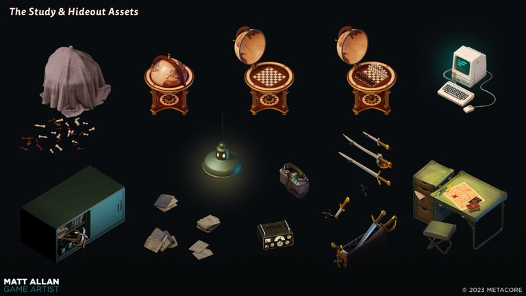 I started out working on some assets for the Study and Hideout, before moving on to co-ordinate and composite mine and others work to build out entire rooms like The Dining Room, Bathroom and rooms yet to be revealed!