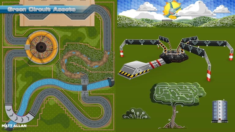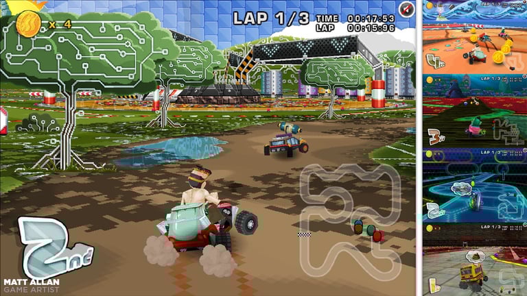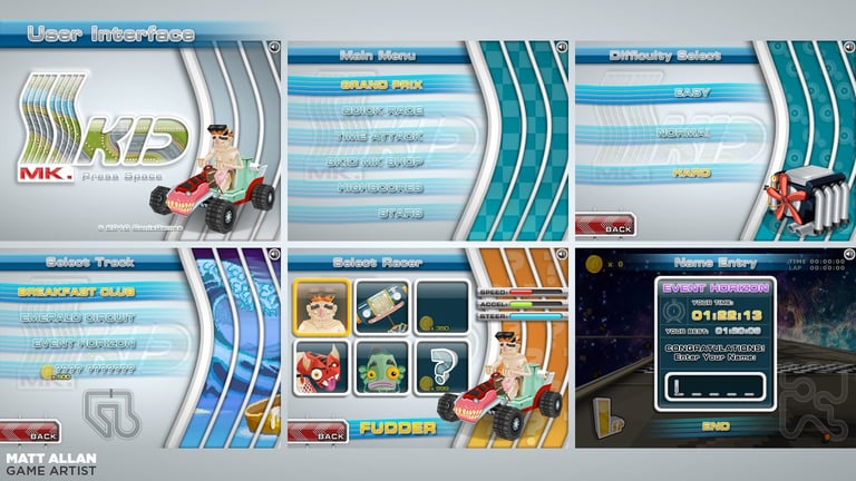 I designed and made all artwork for two tracks (Green Circuit and Deep Streets) the four main characters and karts as well as the UI.