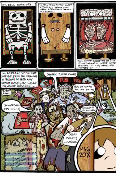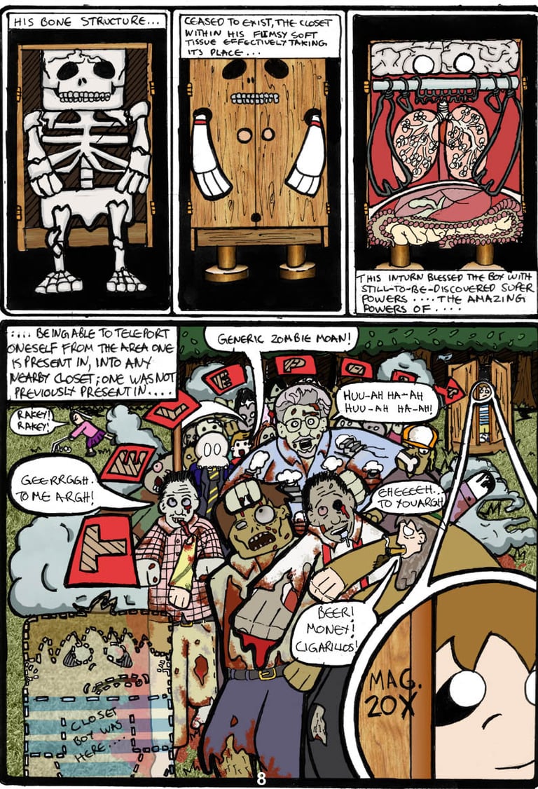 So, over the summer of 2004 I wrote and drew my first comic book “Closet Boy”. Not, as many people assumed, a story penned as a coming of age/coming out comic; but one that tells the story of a boy who suffers a minor accident in a closet factory and ends up having a closet inserted under his skin. As a natural side effect, he also gains the ability to teleport himself into other closets anywhere else in the world. Following?