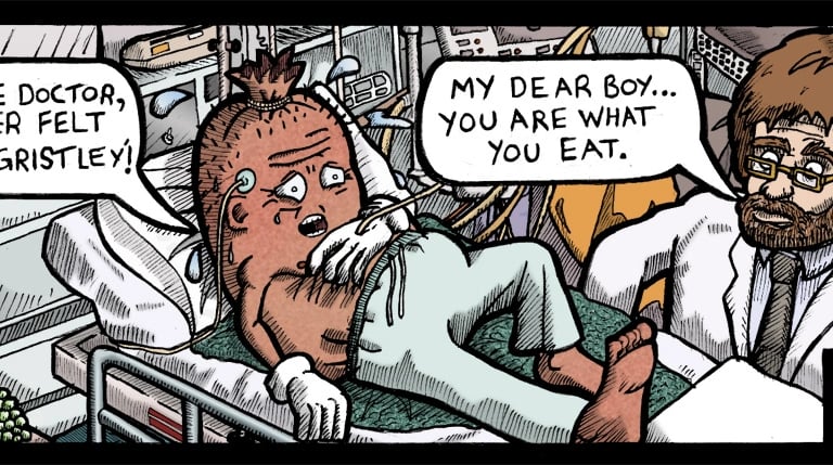 I hand picked a few pieces of work to show above. It was always important to me that I chose topics that could make every one smile, I didn’t desire to be preachy or militant (and never will), but found plenty of fodder for humour about vegan and non vegan issues alike. I’m actually still kind of fond of a few characters from these, the moose, the sausage, there was even a pretty memorable Leek in one of them.