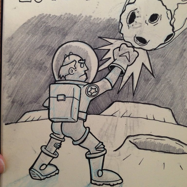 During February, I decided to commit to working on a OneGameAMonth project with my friend João Guerra. The idea would be based on an image I had drawn in my sketchbook previously, of an astronaut punching meteors out of the sky.